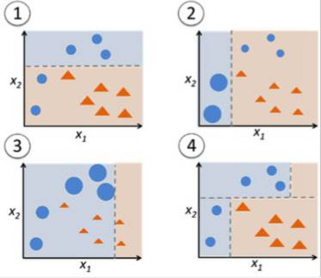 在上图 中,步骤 1、2、3 指的是被称为决策桩(decision stump)的弱学习器(是一个仅依靠一个输入作出决策的 1 级决策树;是一种根节点直接连接到叶节点的决策树)。构造决策树的过程会一直持续,直到用户定义了一个弱学习器的数目,或者训练的时候再也没有任何提升的时候。步骤 4 结合了之前模型中的 3 个决策桩(所以在这个决策树中就有 3 种分支规则)。