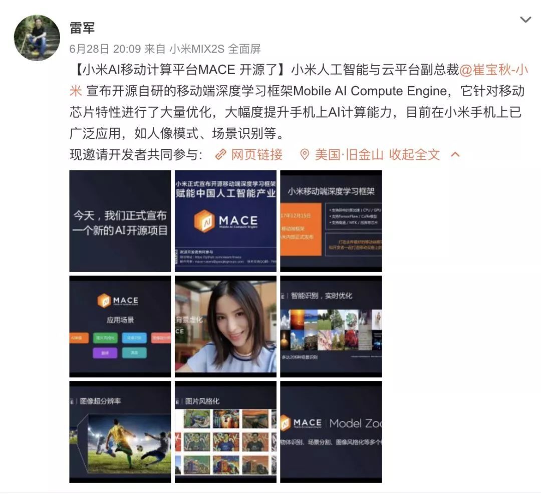6 月 28 日,在第十三届开源中国开源世界高峰论坛上,小米首席架构师、人工智能与云平台副总裁崔宝秋在《小米 AI 时代的开源》的主题演讲中,代表小米正式发布了小米移动端深度学习框架 —— MACE。