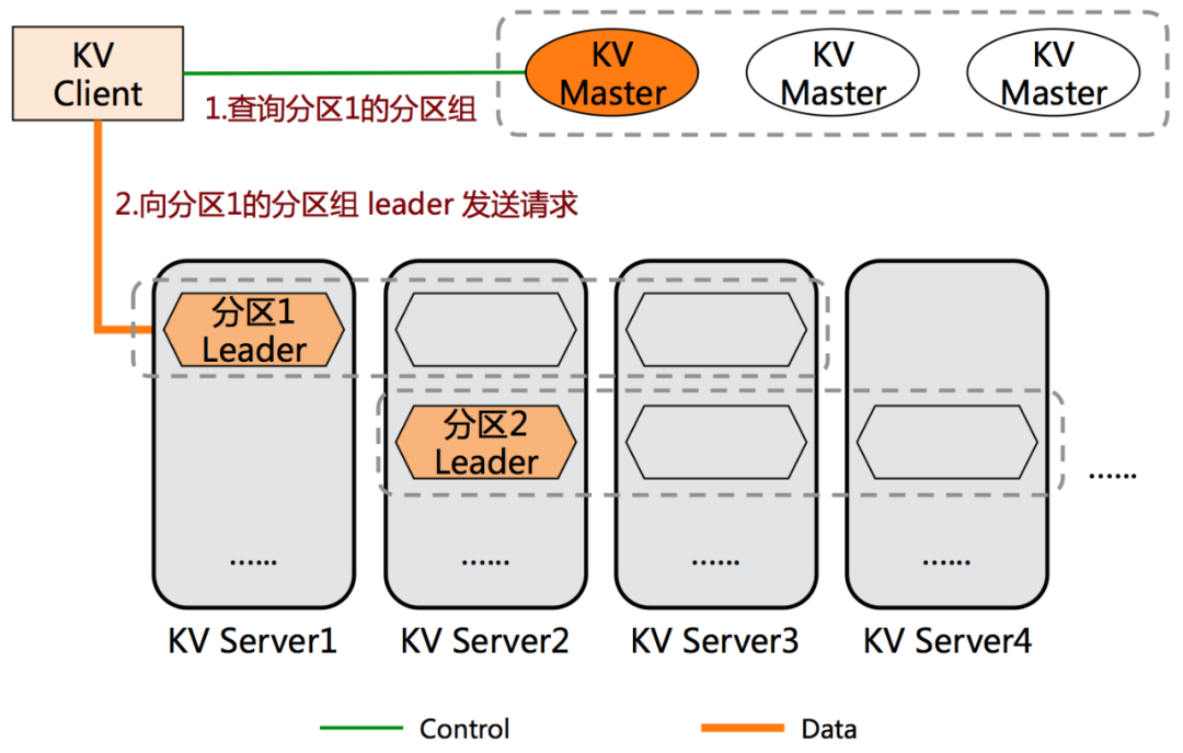 有巢分布式 KV 实现了多实例冗余的特性,把 KV 分解为由多个副本成的分区组(partition group),该分区组通过一致性协议选举出 Leader 节点对外提供服务,当 Leader 节点故障或出现网络分区时,能够快速选出新的 Leader 节点并接管该分区的服务,从而提升 OSS 元数据服务的可用性,如下图所示。