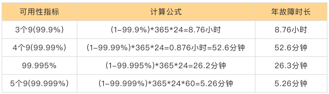 网络服务的可用性,通常会折算为不能提供服务的故障时间长度来衡量,比如典型的 5 个 9 可用性就表示年故障时长为 5 分钟,如下表所示。