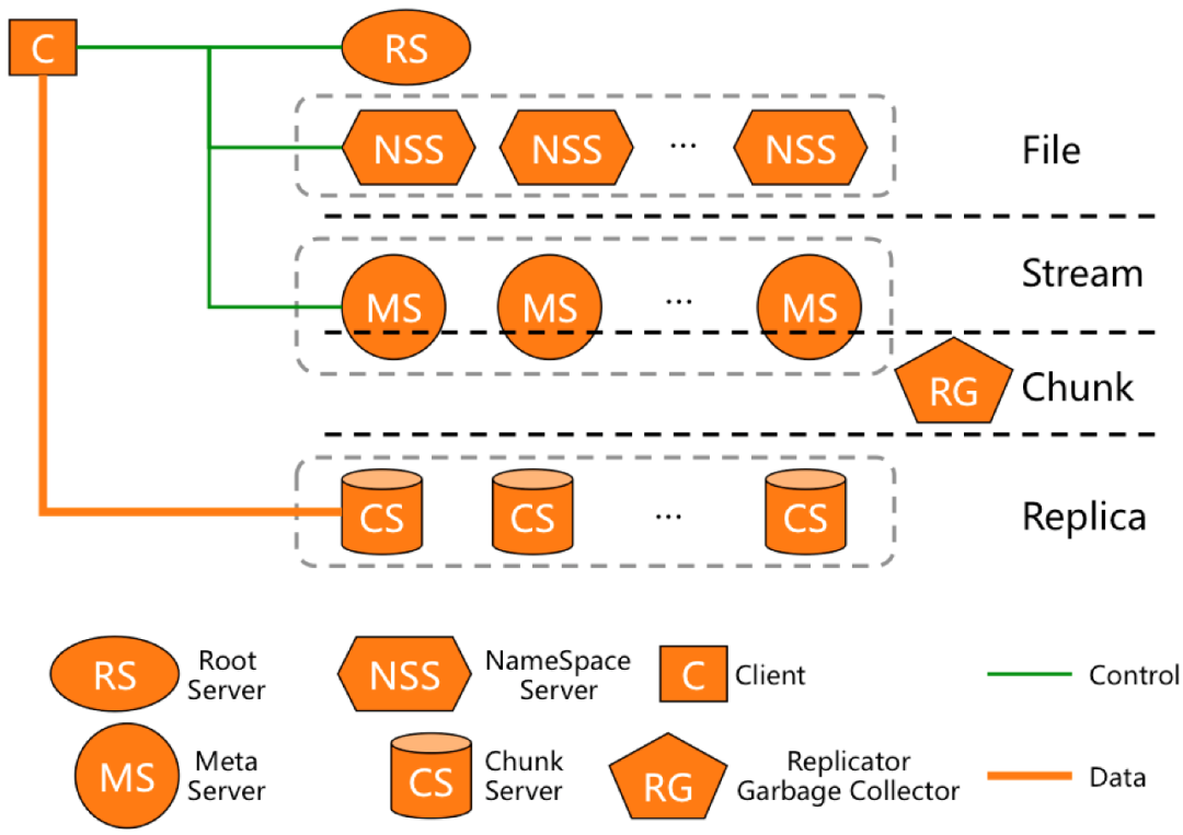 如上图描述的架构所示,各层元数据(RootServer、NameSpaceServer、MetaServer)都提供了冗余设计,故障时可以快速切换,对于数据(ChunkServer)来说通过 None-Stop-Write 特性解决服务器、磁盘故障时的快速切换,从而在分布式存储层提高可用性。