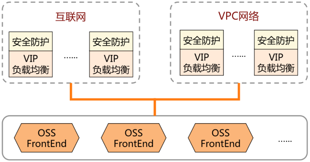 OSS 要承接海量的访问请求,因此接入层采用负载均衡,通过绑定 VIP 提供高可用服务,并且和 OSS 的前端机(FrontEnd)集群对接,任何模块故障都能能够快速切换,保证可用性。OSS 基于阿里云网络团队的负载均衡技术,提供了大流量、高性能访问能力。