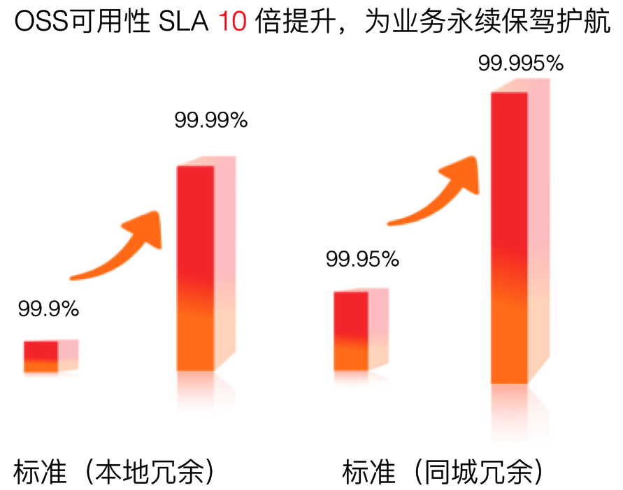 阿里云对象存储 OSS 通过十年积累的技术红利,长期在双十一淘宝应用如丝般顺滑体验需求的打磨下,2020 年 6 月将可用性 SLA 提升 10 倍,其中 OSS 标准型(同城冗余)存储,SLA 从 99.95% 提升到 99.995%,简单理解能支持 10 万张图片最多只有 5 个显示卡,下一章有详细解释。