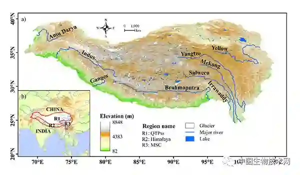 图1 第三极的地貌特征(a)及位置(b)。第三极包括R1: QTPss,狭义的青藏高原;R2: Himalaya,喜马拉雅山地;R3: MSC,中国西南山地