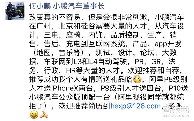 “小鹏汽车在广州、北京和硅谷需要大量人才。欢迎推荐和自荐,推荐成功我个人友情赠送礼品哈。阿里P8级人才送iPhoneX两台,P9级别人才送4四,P10送小鹏汽车公众版顶配一台。”为了招人,何小鹏的朋友圈里直接写出了有奖推荐政策。