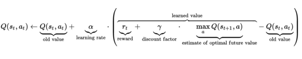 Q 学习是强化学习算法的无模型版本,可用于对任意有限马尔可夫决策过程寻找最优的动作选择策略。程序初始化时,每个动作-价值对的 Q 值由开发者定义,并由 RL 算法在每个时间步进行更新。下图展示了 Q 值的更新公式。