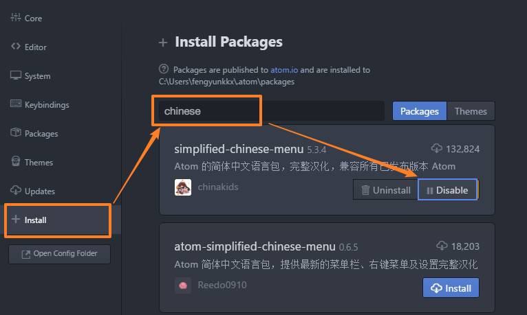 (你可以在 Atom 的 File → Settings → install 中看到这个目录的具体位置)