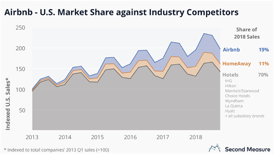 (2013-2018年美国住宿领域市场份额变化情况,图片来自Sencond Measure网站,版权属于原作者)