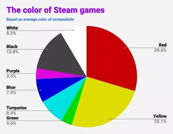 这个饼状图显示的是Steam游戏的颜色,根据Steam游戏截图的平均色彩统计得出。可以看到,红色、黄色和黑白占据了游戏的主色调,也就是说,如果你想让你的游戏,或者你的截图在Steam中最显眼、最独一无二的话,你的选择就是...