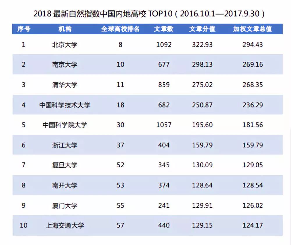 2018年公布的最新自然指数显示:美国发表的论文总数为23849,加权文章总值为15029。中国发表的论文总数为10212篇,加权文章总值为6975。