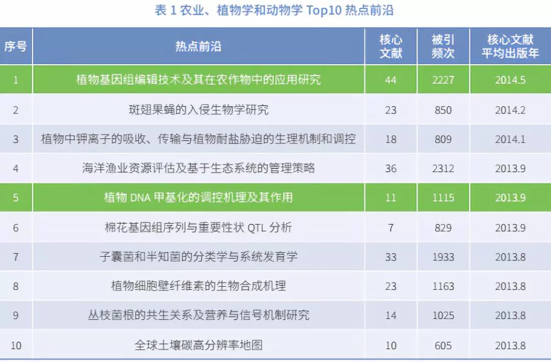 至于100个热点前沿,则更加细化。比如在农业、植物学和动物学领域,2017年的十大热点前沿是: