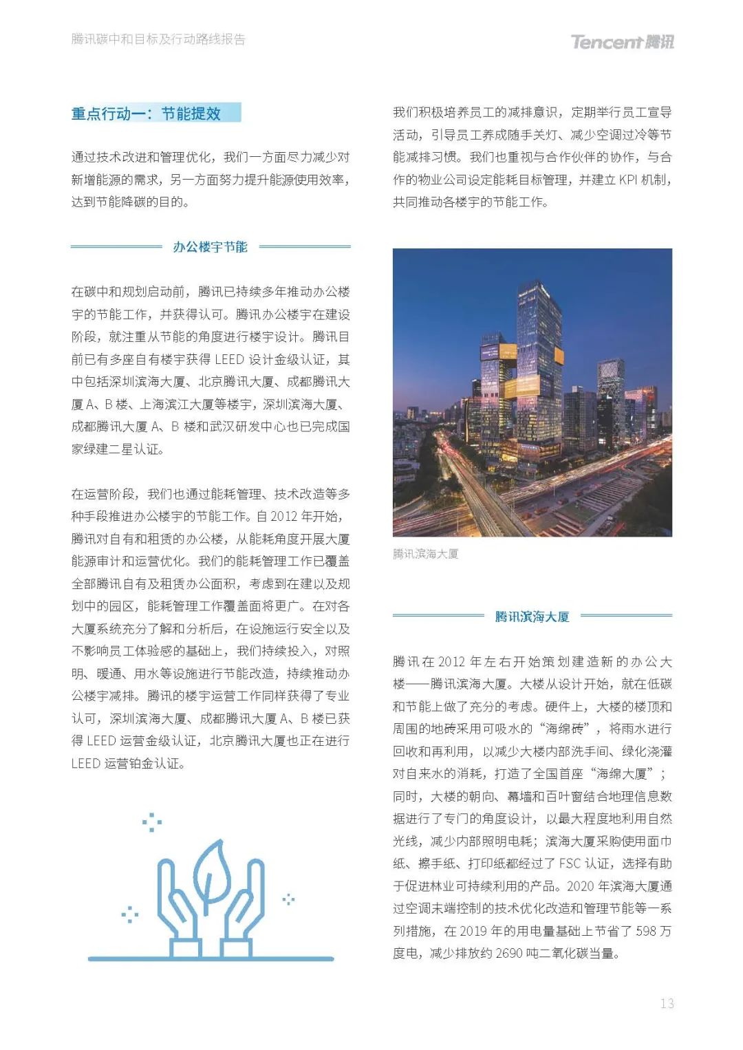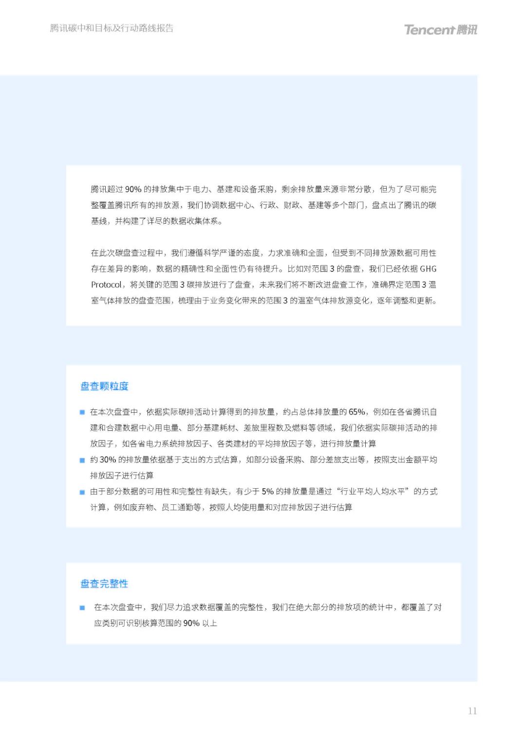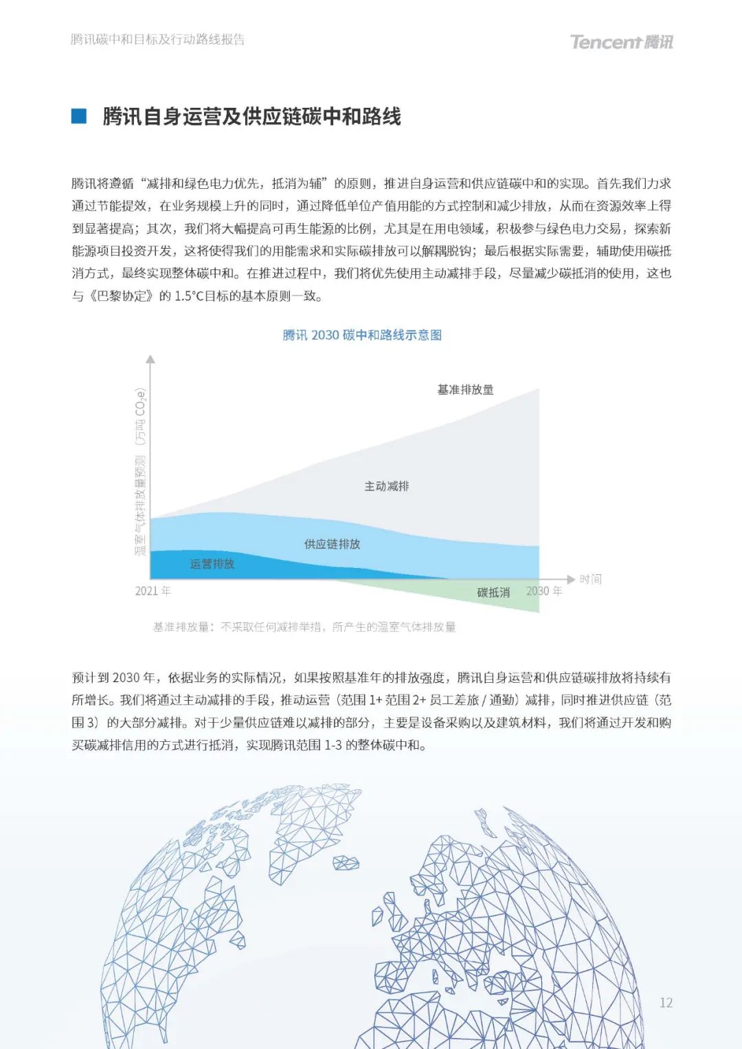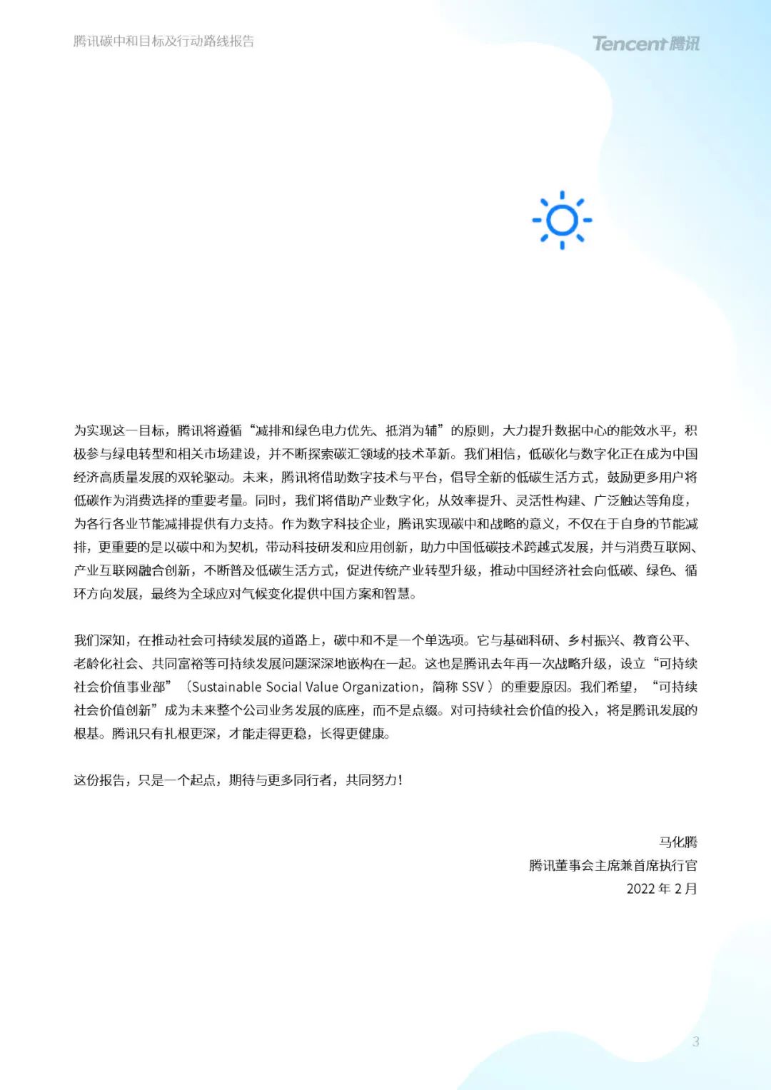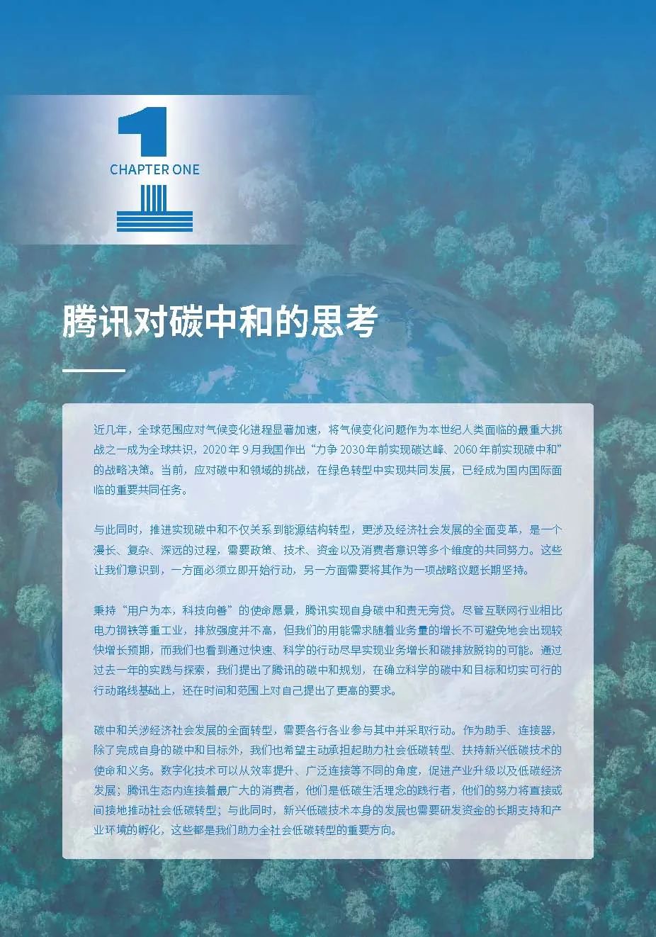 近几年,全球范围应对气候变化进程显著加速,将气候变化问题作为本世纪人类面临的最重大挑 战之一成为全球共识,2020 年 9 月我国作出“力争 2030 年前实现碳达峰、2060 年前实现碳中和” 的战略决策。当前,应对碳中和领域的挑战,在绿色转型中实现共同发展,已经成为国内国际面 临的重要共同任务。与此同时,推进实现碳中和不仅关系到能源结构转型,更涉及经济社会发展的全面变革,是一个 漫长、复杂、深远的过程,需要政策、技术、资金以及消费者意识等多个维度的共同努力。这些 让我们意识到,一方面必须立即开始行动,另一方面需要将其作为一项战略议题长期坚持。秉持“用户为本,科技向善”的使命愿景,腾讯实现自身碳中和责无旁贷。尽管互联网行业相比 电力钢铁等重工业,排放强度并不高,但我们的用能需求随着业务量的增长不可避免地会出现较 快增长预期,而我们也看到通过快速、科学的行动尽早实现业务增长和碳排放脱钩的可能。通过过去一年的实践与探索,我们提出了腾讯的碳中和规划,在确立科学的碳中和目标和切实可行的 行动路线基础上,还在时间和范围上对自己提出了更高的要求。碳中和关涉经济社会发展的全面转型,需要各行各业参与其中并采取行动。作为助手、连接器, 除了完成自身的碳中和目标外,我们也希望主动承担起助力社会低碳转型、扶持新兴低碳技术的 使命和义务。数字化技术可以从效率提升、广泛连接等不同的角度,促进产业升级以及低碳经济 发展;腾讯生态内连接着最广大的消费者,他们是低碳生活理念的践行者,他们的努力将直接或 间接地推动社会低碳转型;与此同时,新兴低碳技术本身的发展也需要研发资金的长期支持和产 业环境的孵化,这些都是我们助力全社会低碳转型的重要方向。