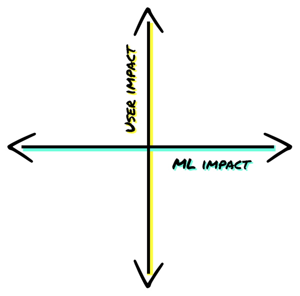 此图能够将有影响力的想法与不那么有影响力的想法分开,并且看出哪些想法依赖于机器学习而不是或者可能仅仅从中受益。你应该已经在工程项目中进行过类似谈话。如果没有,那么这正是绝佳的时机让他们了解机器学习的现实与人们的想法。无论是最大用户影响力,还是机器学习的独特性(图的右上方)应该时刻成为团队注意的焦点。