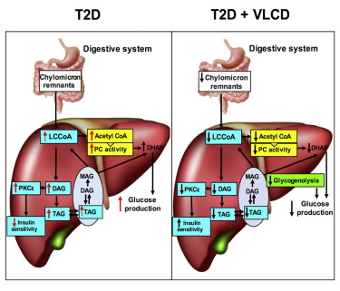 最终,研究人员确定了三种与“VLCD在糖尿病动物中快速降低血糖浓度这种显著作用”相关的主要机制。具体来说,在肝脏中,VLCD通过以下3种途径降低葡萄糖产生:1)减少乳酸和氨基酸转化为葡萄糖;2)降低肝脏糖原转化为葡萄糖的速度;3)降低脂肪含量,这反过来,改善了肝脏对胰岛素的响应。值得一提的是,研究者们仅在3天内就观察到了VLCD这些积极的影响。