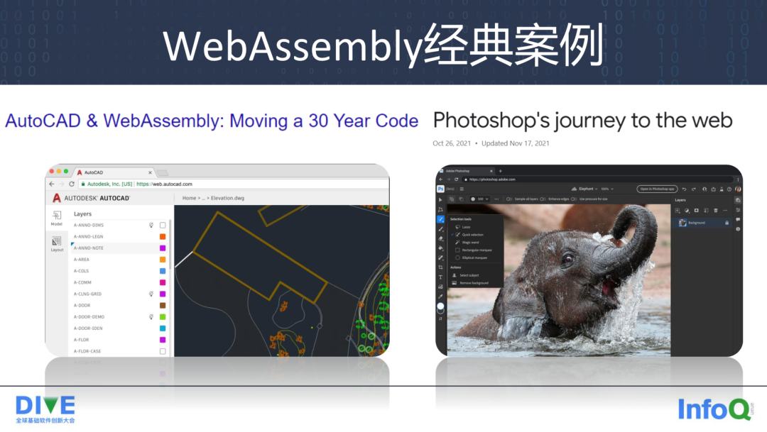 我们看下两个基于 WebAssembly 经典的使用案例。左边是 AutoCAD 在浏览器上运行,能把 30 年积累的桌面应用代码移植到到了浏览器上面,这主要归功于把大量的 C/C++ 代码转换成 WebAssembly。2021 年另外一个标志性的事件就是 Adobe 也把它的经典的软件 Photoshop 搬移到了浏览器上面。据相关技术分析,Photoshop 的 Web 版应用主要也是基于 WebAssembly,当运行应用的时候,可能会有高达 1G 左右的本地磁盘的缓存,只需下载 10 多兆的网络资源,启动时间大概 3 秒钟左右。整个应用充分地利用了 WebAssembly 和多核的技术,在运行一些操作的时候,最热的 20 个函数里面,SIMD 向量化计算的占有率约为 40% 左右,这说明通过类似于向量化计算的能力,WebAssembly 已经具备了支持开发强计算应用的能力。
