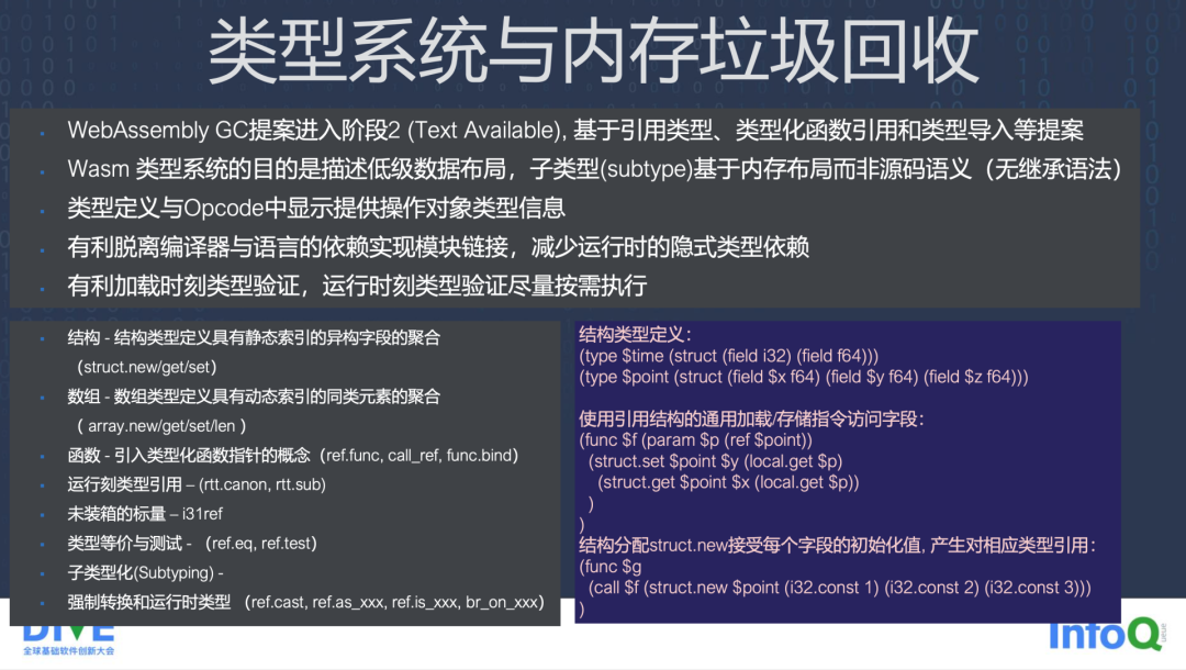 刚才在字节码里面已经看到类型信息,它所有的函数都是有一个类型的定义,而且类型是有从 0 开始的索引编号。垃圾回收特性 (GC) 目前进入了文本可用的提案 2 的阶段,它包含着一系列的所依赖的 Spec,如引用类型 Reference Type,还有就是类型化函数引用 Typed Function Reference,类型导入这些提案等。
