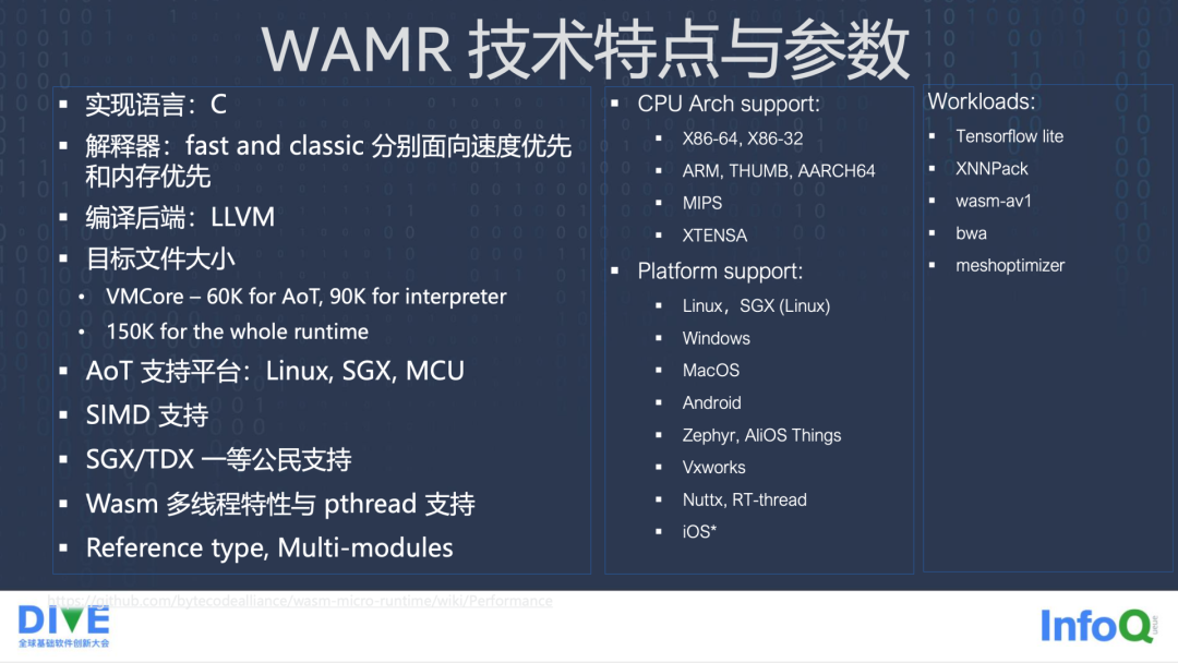 WAMR 支持 JIT 和 AoT,JIT 和 AoT 目前是基于 LLVM 框架来实现的,整个 Runtime 的特点就是说它的 VMCore 很小,在 100K 以内,但同时它的性能又非常好。一方面借助 LLVM 这个非常好的编译框架,它的性能和 GCC 相比,根据不同的 Workload,从 60%、70%、80%、90%,甚至还有快过 GCC 原生编译的。另外它的 AoT 也是个很特色的设计,因为它有个完全自定义的 AoT 的加载机制,不依赖于系统的 Loader,它可以在很多的平台上都可以用,像 Linux 或者 SGX 环境,甚至像一些 MCU 上的嵌入式操作系统,也可以使用 AoT 的 Loader。另外它支持向量化计算,对于 Intel SGX 和 TDX 这种安全的执行环境有非常良好的支持。它还支持多线程、pthread、Reference type 和 Multi-modules 等丰富的特性,欢迎大家能花点时间了解体验下。