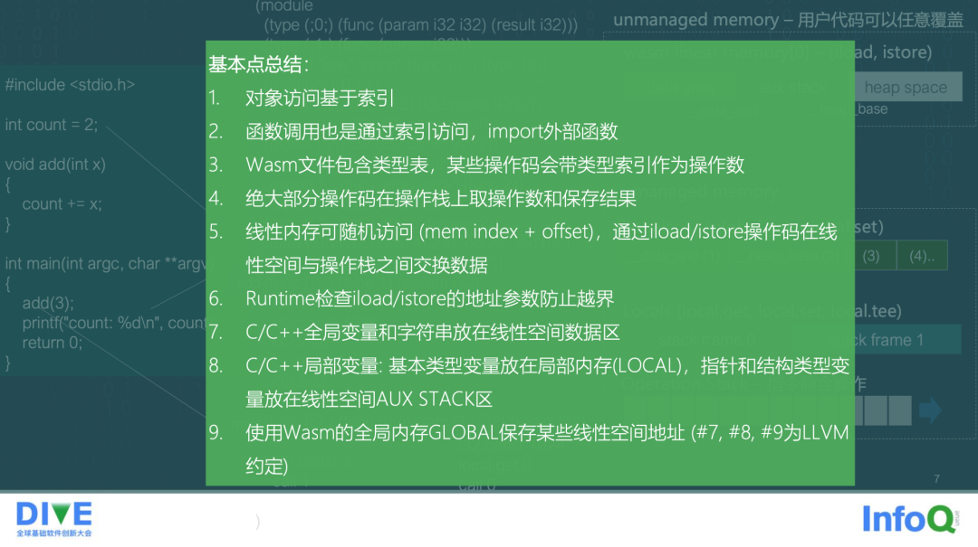 右边上部是一个线性内存,支持 Wasm 编程来任意访问其中的任何一个位置。线性内存的读写访问需要通过字节码 iload 和 istore。iload 把线性空间中的数据移动到操作栈,其具体过程首先将偏移量设到栈里边,调这个指令之后它会从栈里面取偏移量,从线性空间的偏移量去访问拿到值,再把值压回到栈里面。istore 指令则是执行一套反向的流程。
