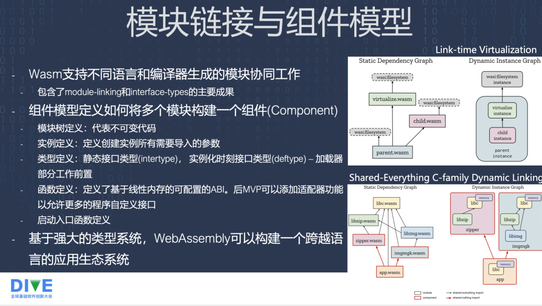 还有一种模式叫 Shared-Everything C-family Dynamic Linking,可以在动态的过程中,由不同的模块组成不同的实例。比如说 zipper,它也引用了 libc,它可以构建一个单独的一个实例,img 它可能也引入了一系列,包括 libc、libzip,但是它们可以组织成一个 instance,它有它自己的内存空间和一个实例所需要的元素,既具有很好的隔离性,又具有很好的灵活性。