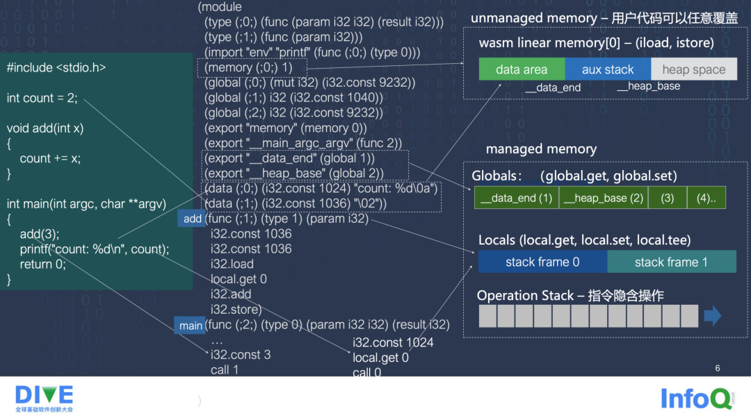 还有一种受管内存叫做 Locals,Locals 对应的字节码叫做 local.get、local.set,以及 tee。Locals 它是以当前的栈为基准的,在执行指令的时候,缺省就是当前的栈作为基础来进行访问和定位的。源码中基本类型的函数局部变量,可以使用 Locals 来映射,其他类型局部变量则会使用线性内存中 Aux Stack 来管理。和线性内存操作相比,Global 和 Local 操作目标的索引值是固定在 Wasm 文件中,说明其在编译时刻决定。而线性内存的访问地址是由 Wasm 程序逻辑本身在运行时来决定。