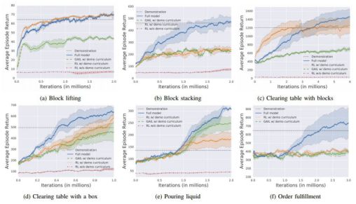 为了解决这些挑战,本论文研究者提出的方法将模仿学习和强化学习结合起来,构建一个统一训练框架。该方法以两种方式利用演示数据:使用混合奖励,基于生成对抗模仿学习将任务奖励与模仿奖励结合起来;使用演示轨迹构建状态的课程(curriculum),以在训练中初始化 episode。因此,该方法解决了全部六个任务,这些任务单凭强化学习或模仿学习都无法解决。