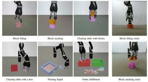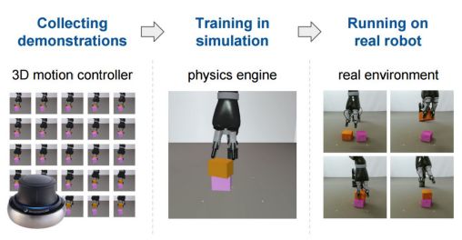 图 1. 研究者提出的机器人学习流程。研究者使用 3D 运动控制器收集某项任务的人类演示。本论文提出的强化学习和模仿学习模型利用这些演示促使模拟物理引擎的学习。然后执行 sim2real 迁移,将习得的视觉运动策略迁移至真正的机器人。