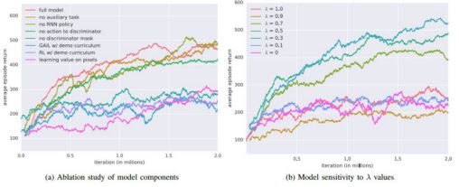 图 4. 论文提出的强化与模仿学习模型和基线学习效率的对比。该图展示的是 5 次不同随机种子运行的平均值。所有策略使用同样的网络架构和超参数(λ 除外)。