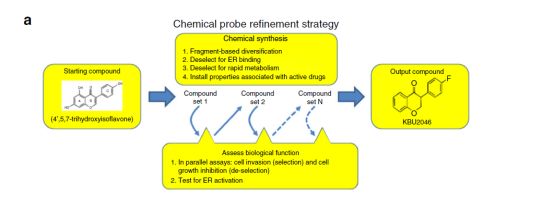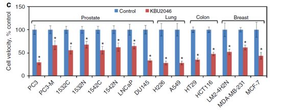 研究人员以4,5,7-三羟基异黄酮为研究起点,通过对其生化功能的不断改进和筛选获得了靶向肿瘤细胞运动的高选择性分子探针KBU2046。同时,研究人员发现KBU2046能够阻断人类前列腺癌,乳腺癌,结肠癌和肺癌细胞的迁移。