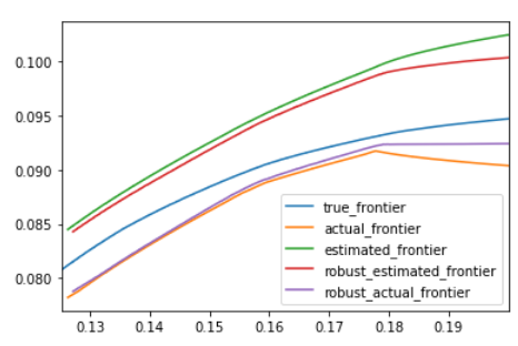 4) 对2)中模型,引入估计误差,得到稳健的估计有效前沿(robust_estimated_frontier)(红色线),它更接近蓝色目标线;