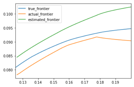 绿色线是估计有效前沿,它在蓝线(真实有效前沿)上方,表明根据输入变量的估计值计算出来的投资组合收益率被高估了。
