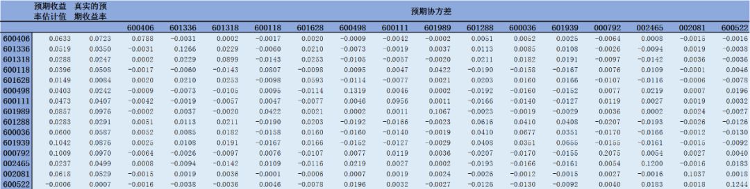 随机挑选15只股票,计算出每个股票的真实预期收益率、预期收益率估计值和协方差矩阵(在实际中,真实的预期收益率是不可得的,在此处,为了描述真实结果与预测结果的偏离,我们选取已知收益率的股票做一次回测):