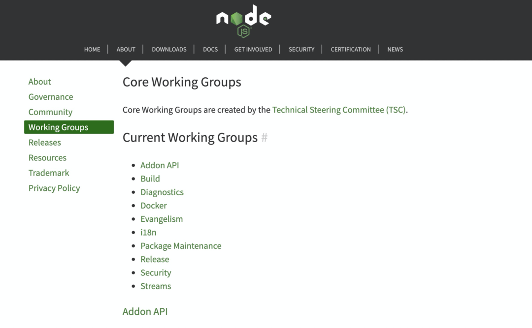 工作组由 Technical Steering Committee (TSC) 创建,当前一共有 10 个工作组。