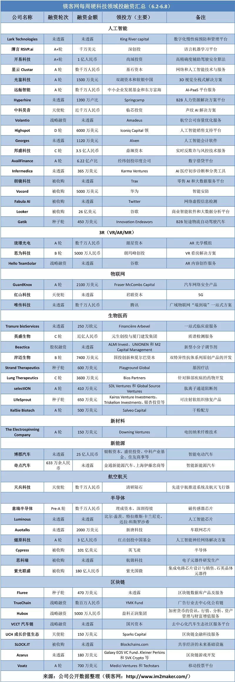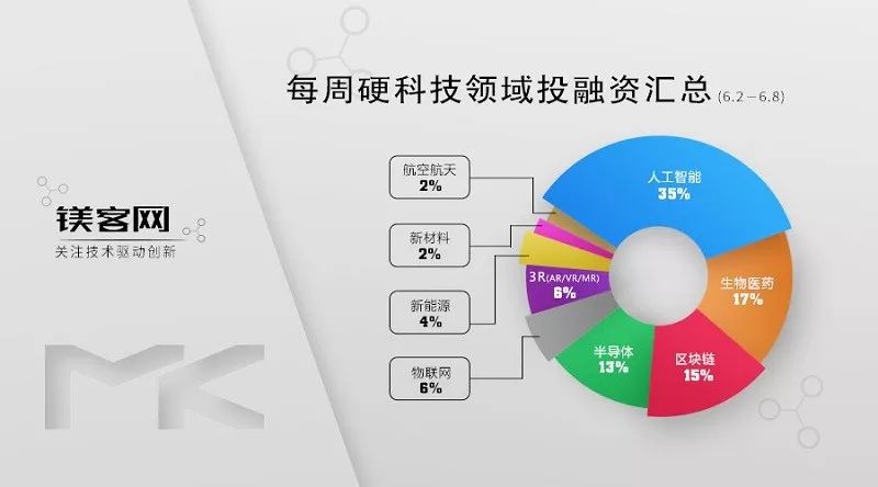 本周硬科技领域投融资事件一共53起,人工智能领域发生15起融资事件和4起收购事件,占比35%;生物医药领域发生9起融资事件,占比17%;区块链领域发生8起融资事件,占比15%;半导体领域发生4起融资事件和3起收购事件,占比13%;3R(VR/AR/MR)、物联网领域分别发生3起融资事件,分别占比6%;新能源领域发生2起融资事件,占比4%;新材料、航空航天领域分别发生1起融资事件,分别占比2%。