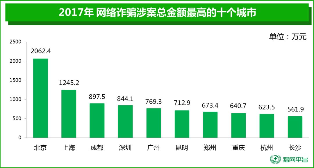 从各城市网络诈骗涉案总金额来看,北京以2062.4万元位居榜首,其次上海(1245.2万元)、成都(897.5万元)、深圳(844.1万元)、广州(769.3万元)和昆明(712.9万元)的涉案总金额也在700万元以上。