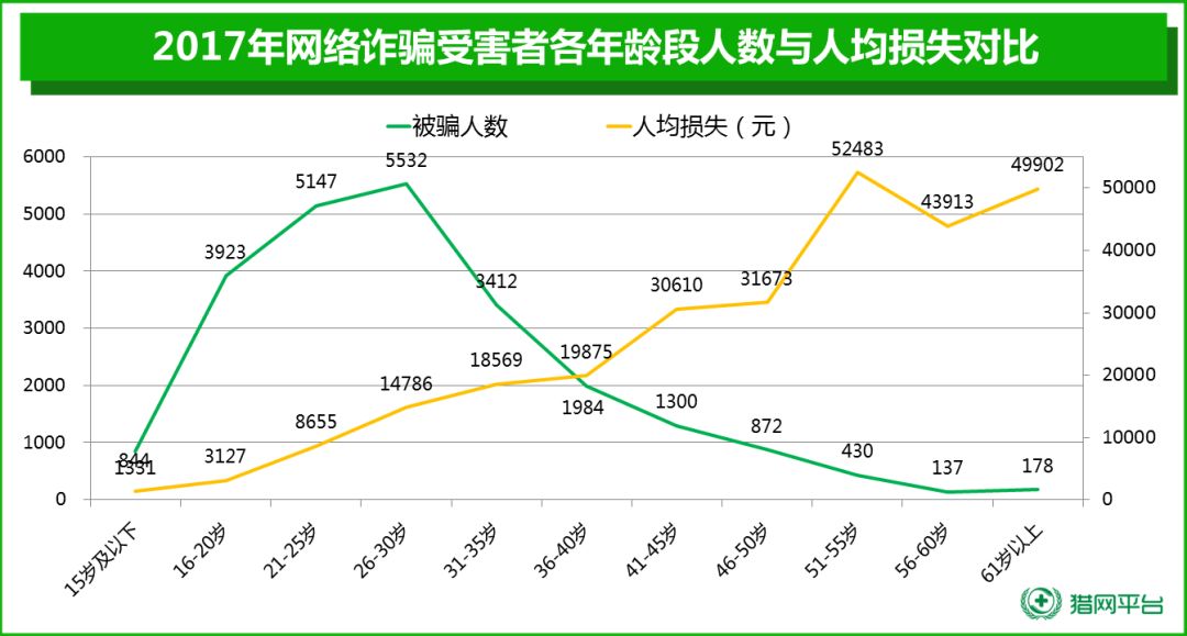 下图给出了网络诈骗受害者年龄段人数与人均损失的对比,从图中可以看出,随着年龄的增长,受害者人均损失也在增长。16-30岁之间的用户,是上网的主力人群,被骗的人数虽多,但由于年轻人经济能力有限,被骗平均金额相对较少。45岁以后的受害者,年龄越大,经济能力也越强,虽然上网的人群、时间在减少,但被骗平均金额迅速增长,超过了30000元。
