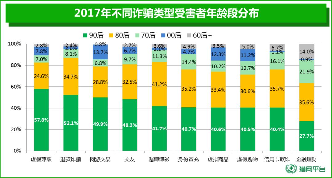 下图给出了不同类型的网络诈骗受害者的年龄段分布情况。从图中我们同样可以看出,在网络兼职和退款诈骗的受害者中,一半以上为90后。其他诈骗类型中,90后也是诈骗的主要群体。事实上,90后年轻人刚踏入社会,或初涉职场,在职业方面尚缺少基本的安全防范知识,所以也最容易调入虚假兼职这种看似挣钱轻松,挣钱快的网络诈骗陷阱中。