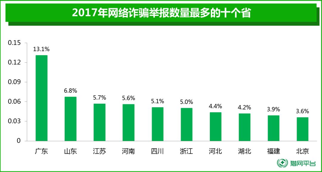 从下图可以看出,经济发达及人口大省是网络诈骗举报最积极的区域。同时也反应出该地区网络诈骗受害者更多。