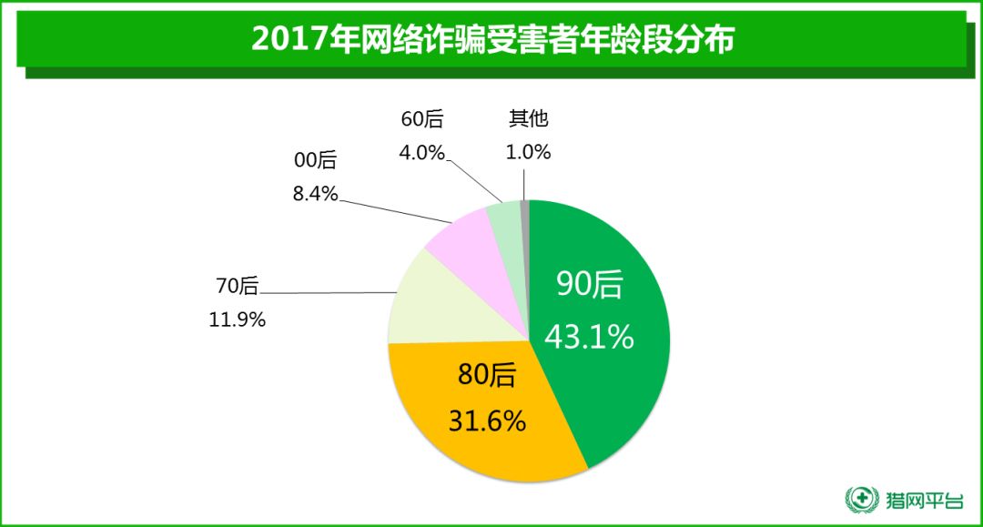 从被骗网民的年龄上看,90后的网络诈骗受害者占所有受害者总数的43.1%,其次是80后占比为31.6%,70后占比为11.9%,00后占比8.4%,60后占比为4.0%,其他年龄段仅占1.1%。特别值得注意的是,00后遭遇网络诈骗开始增多,2016年仅有3.0%的00后进行举报,而今年却增长到8.4%,可见随着00后年龄的不断增长,其也渐渐成为网络诈骗的重要目标。