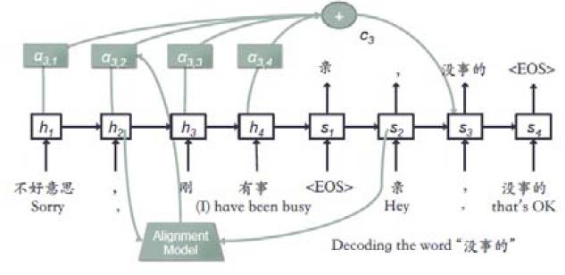 面向 open domain 的聊天机器人目前无论在学术界还是在工业界都是一大难题,目前有两种典型的方法:一是基于检索的模型,比如文献 [19-20],其基本思路是利用搜索引擎通过计算相关性来给出答案;二是基于 Seq2Seq 的生成式模型,典型的方法如文献 [21-22],其网络结构如图 12 所示。