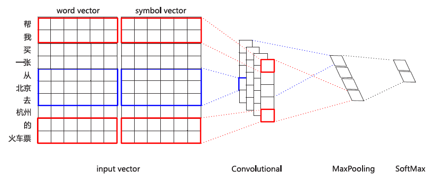 单纯以 word vector 为输入的 CNN 分类效果,在某些领域上无法超越复杂特征工程的 SVM 分类器。如何进一步提升深度学习的效果,其中一个探索方向就是试图把分布式表示和符号表示进行融合。比如对于「刘德华的忘情水」这句话,通过知识库可以标注刘德华为 singer、忘情水为 song,期望能把 singer 和 song 这样的符号表示融入到网络中去。具体融合方法,既可以把符号标签进行 embedding,然后把 embedding 后的 vector 拼接到 word vector 后进行分类,也可以直接用 multihot 的方式拼接到 word vector 后面。分布式表示和符号表示融合后的 CNN 结构如图 6 所示。