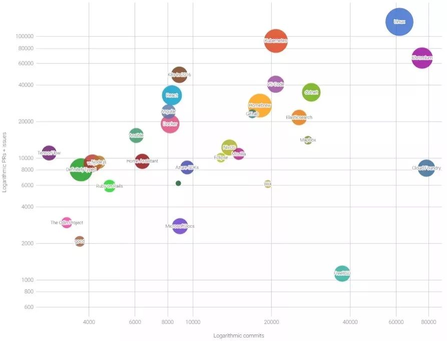 这是一个气泡图,Y轴绘制了每个项目的issues以及pull requests的数量,X轴则绘制了项目成员所完成的提交数量,气泡本身则显示了社区的相对大小。这个大小其实是每个项目中作者数量的平方根,Linux内核在当时以2843个作者居首,紧随其后的是Kubernetes的2380个和Docker的1346个。