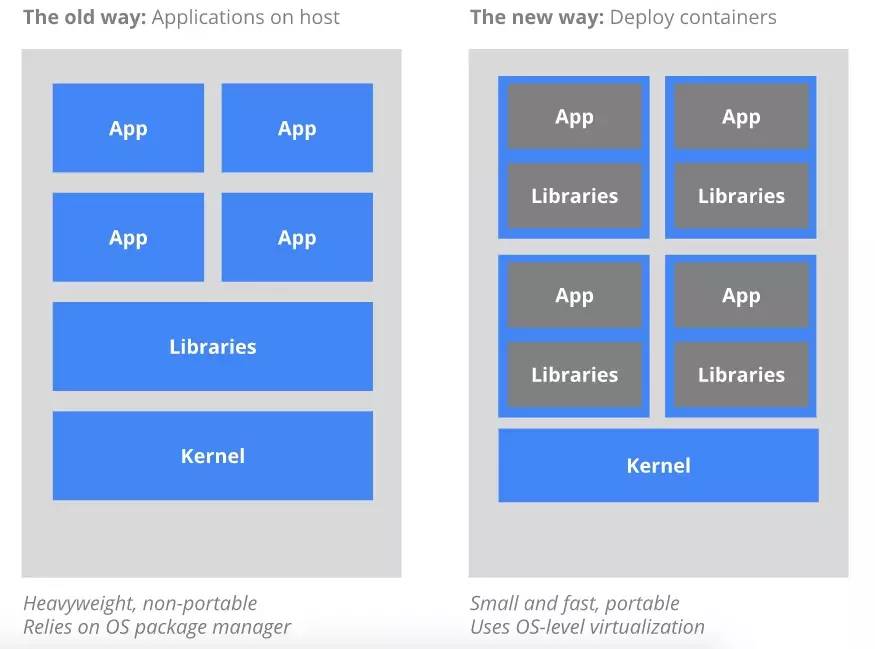 程序部署的传统方法是指通过操作系统包管理器在主机上安装程序。这样做的缺点是,容易混淆程序之间以及程序和主机系统之间的可执行文件、配置文件、库、生命周期。为了达到精准展现和精准回撤,你可以搭建一台不可变的虚拟机镜像。但是虚拟机体量往往过于庞大而且不可转移。