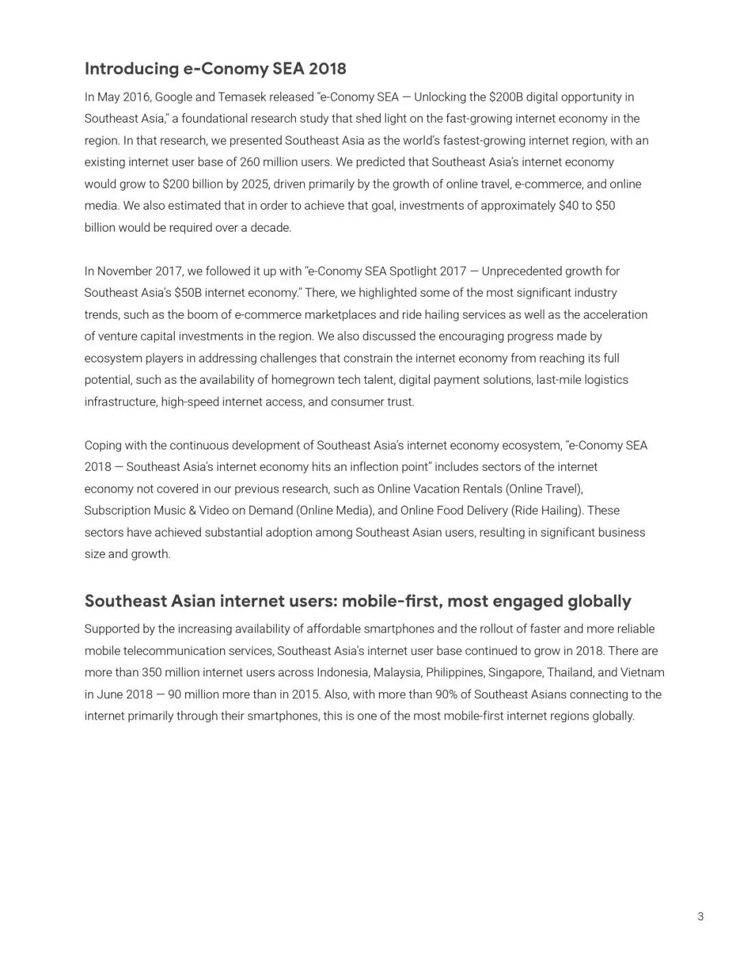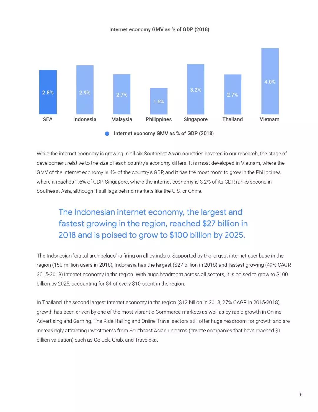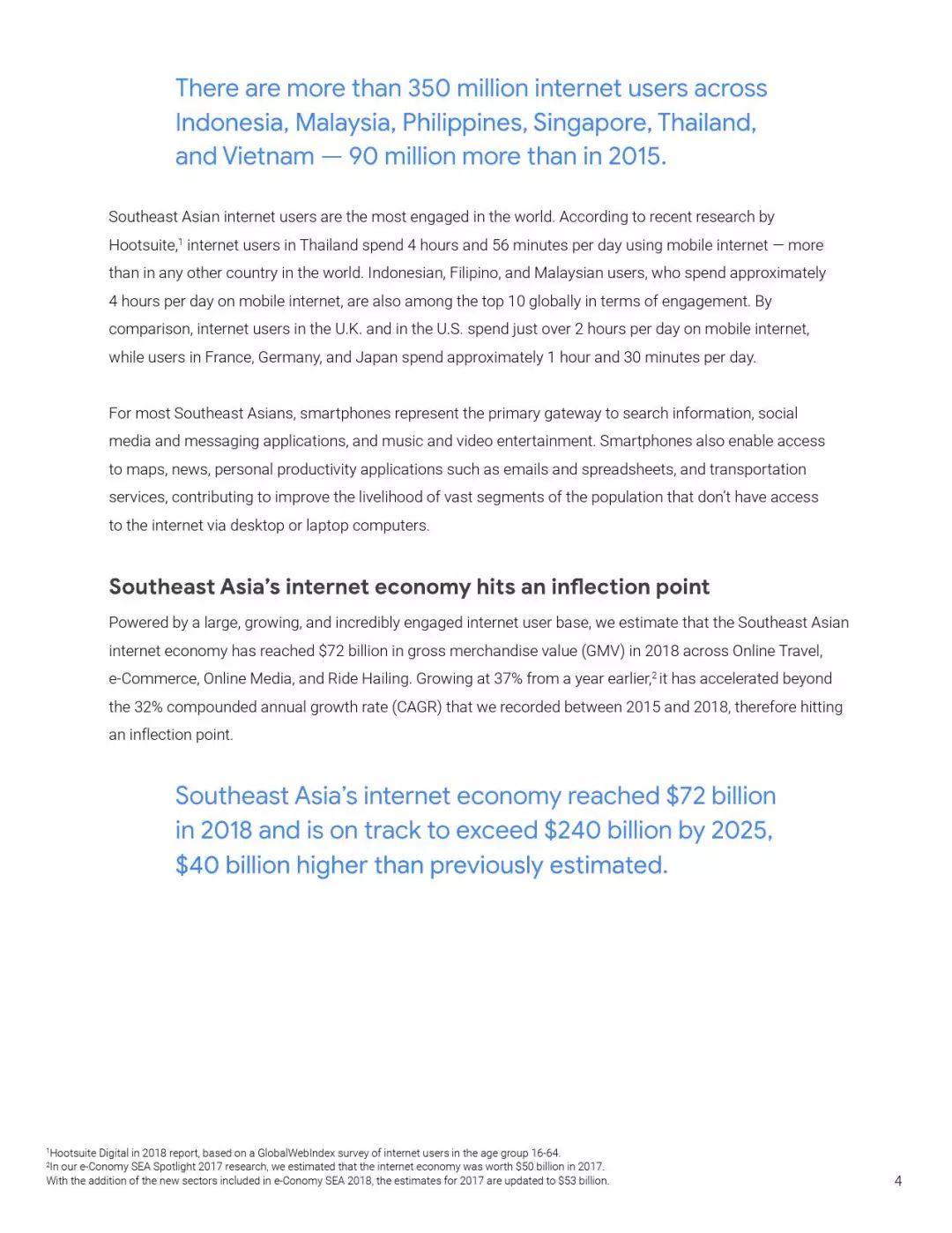 2018年6月,印度尼西亚、马来西亚、菲律宾、新加坡、泰国和越南网民数量超过3.5亿人,比2015年增长了9000万网民,其中超过90%主要使用智能手机上网。同时,东南亚网民也是在线时长最长的,例如泰国网民每天花4小时56分钟访问移动互联网,远超过地球上的其他国家。