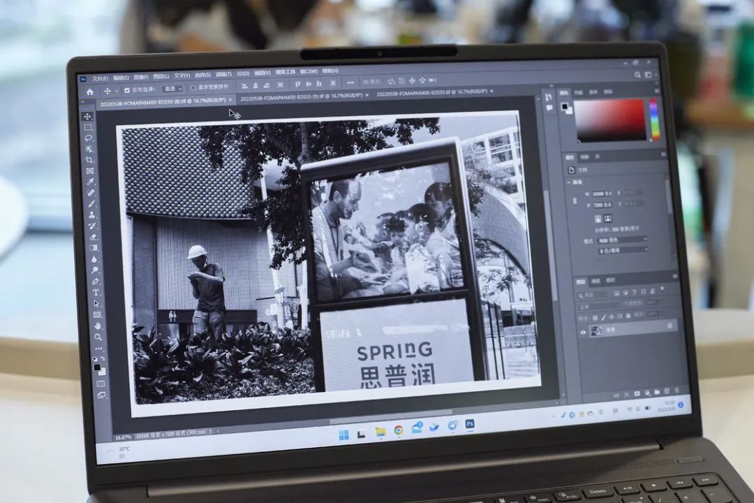在收到小新 Pro 16 后的第一天,我就将它带进了日常工作。如很多读者朋友所知,我有打开应用之后不关闭的习惯,而且浏览器里也经常堆积着大量标签,但对于小新 Pro 16 的来说,即使同时将《PowerPoint》《Word》《Photoshop》和浏览器等都放在前台同时运行,也完全无法对电脑构成性能压力。尤其在多应用同时开启、频繁切换,或者 PS 批量导入大文件时,都能明显感受到 PCIe 4.0 的 SSD 和 LPDDR5-6400 组合带来的顺滑。