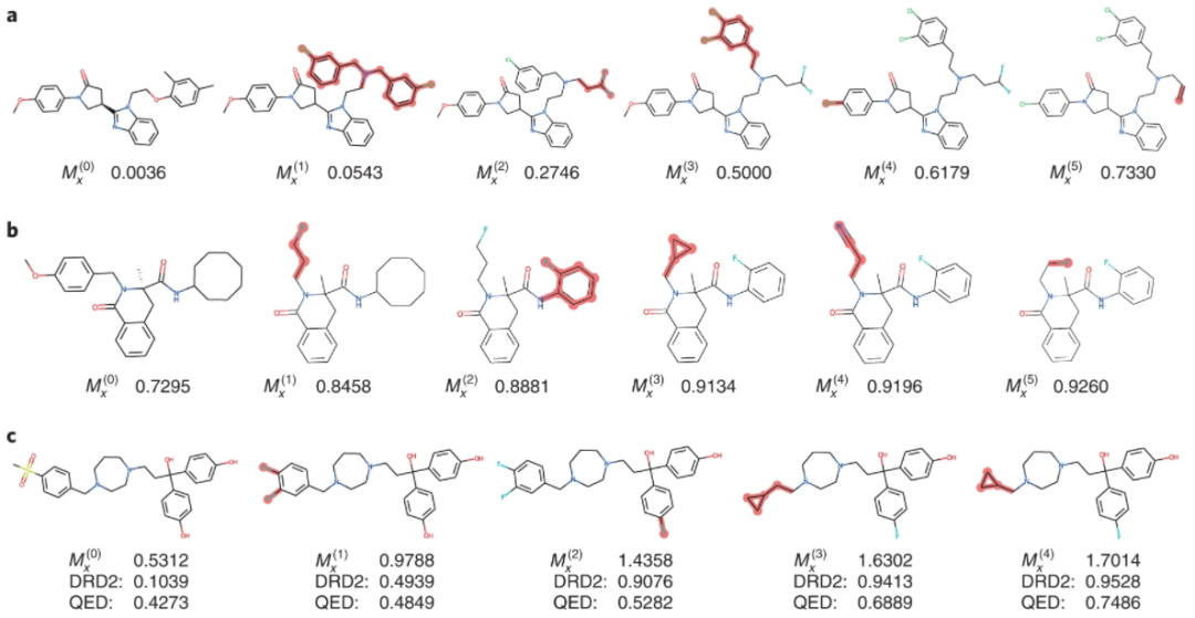 尽管在计算上很有吸引力,但这些方法在一个非常重要的方面并不符合体外分子优化过程:分子优化需要保留分子的主要支架,但生成完整的新分子结构可能无法复制支架。因此,这些方法在告知和指导体外分子优化的潜力方面受到限制。