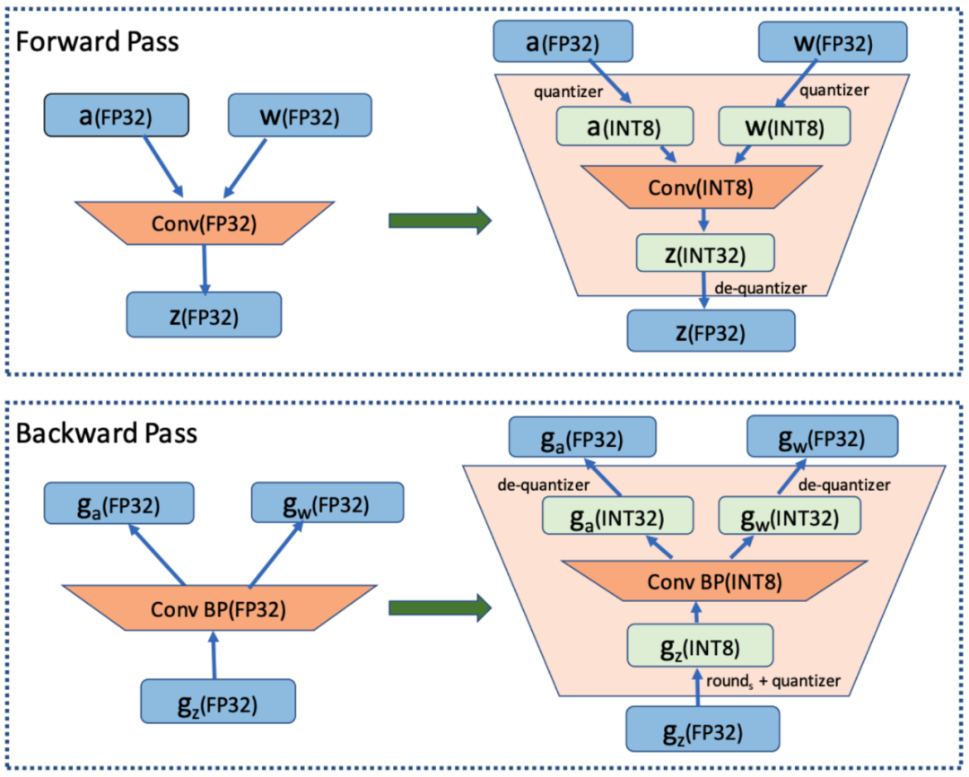 本文INT8训练是将图中上半部分左侧橙色部分替换成右侧橙色部分,将浮点计算变换成定点计算,再通过反量化回到浮点数域的过程。