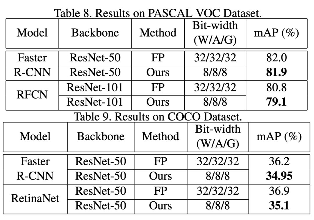 目标检测任务:同时,本文也首次尝试在PASCAL和COCO等目标检测数据集上进行INT8训练实验,精度损失也在2%以内。