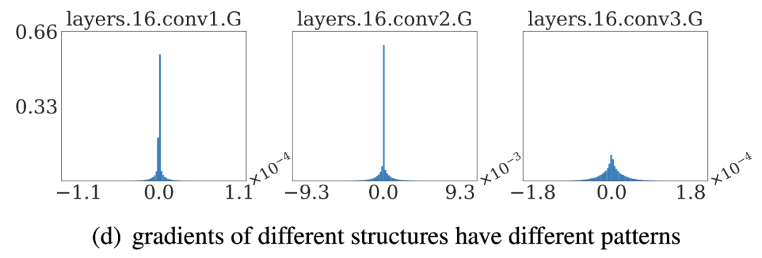 从图(d)中可以看出卷积的结构也会影响梯度分布,对于MobileNetV2模型来说,conv2为depthwise卷积其相比conv1和conv3具有更加尖锐的分布。