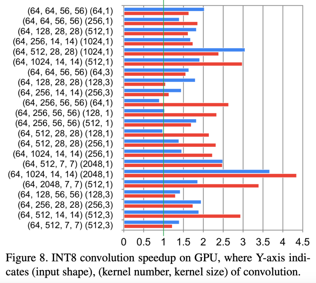 已有的少量探究梯度量化的论文[4]均未报告算法在实际训练任务中的真实加速性能,为了最大限度将方法实用化,本文在 GeForce GTX1080TI显卡上编写并优化了用于支持INT8训练的卷积前向和后向计算核心。