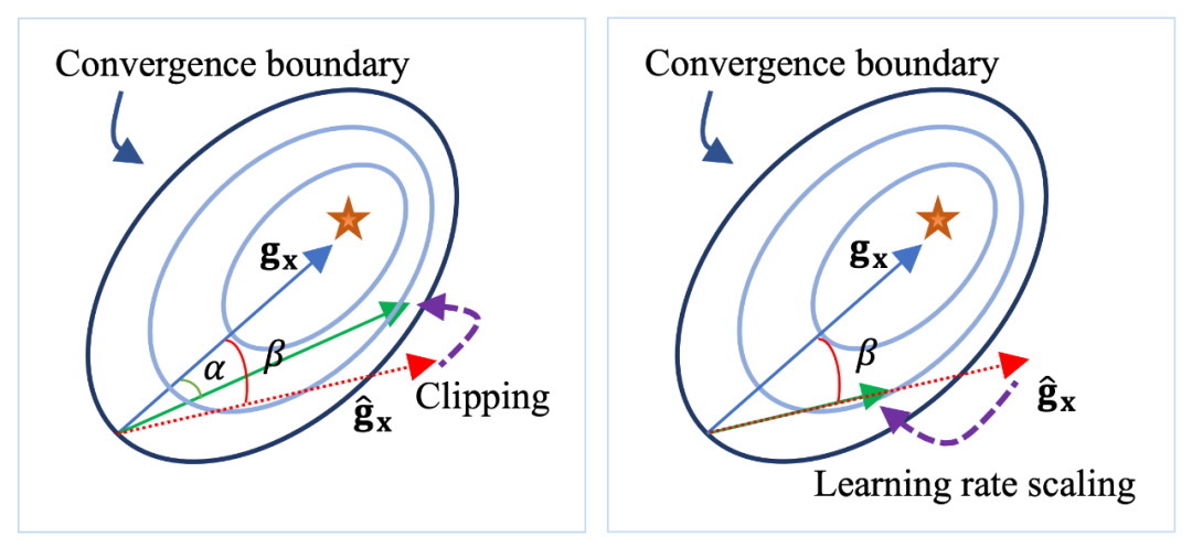 以图2为例,上图中的五角星是优化的最优点(即蓝色箭头指向的点),左边图做量化时的红色箭头存在量化误差,偏离了最优方向,这时候做一个截断,使得红色的箭头变到绿色的箭头,更接近五角星,收敛性更好一些。